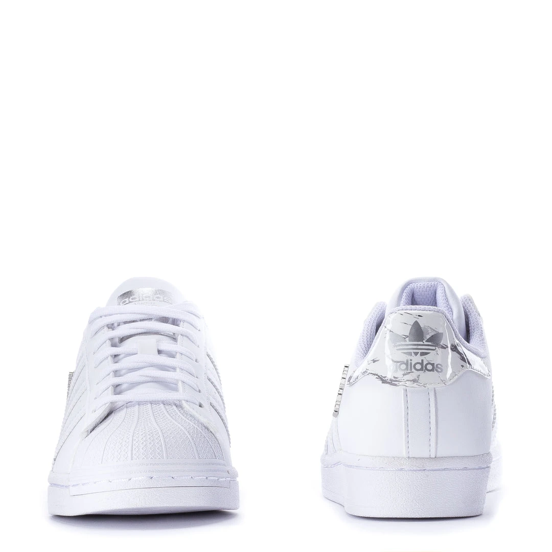 Ready for a wardrobe refresh? The adidas Superstar youth shoes are designed with a monochromatic look that flashes metal hardware and marble-print details. The rubber shell toe, serrated 3-Stripes, and iconic cupsole keep the look rooted in adidas heritage.