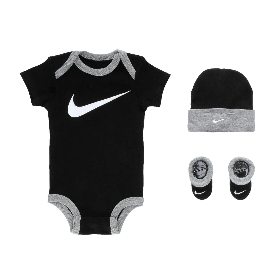 Head-to-toe comfort. The Nike Box Set includes a cotton bodysuit with matching hat and booties for go-to coverage that’s soft on skin. The bodysuit has lap shoulders and snap closures to make changing and dressing easy.