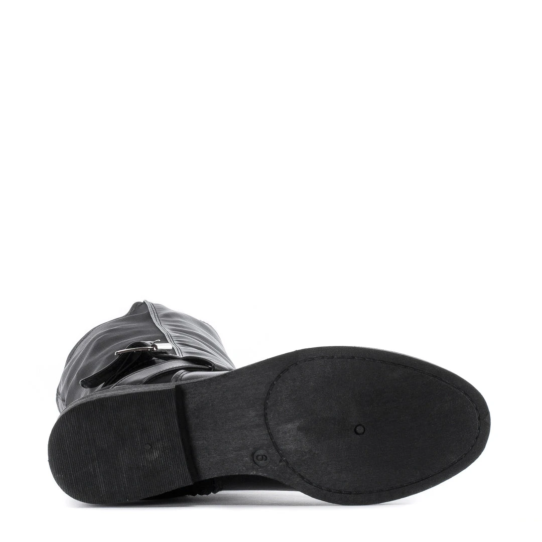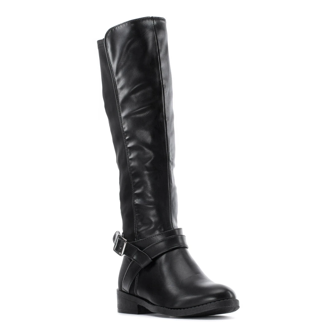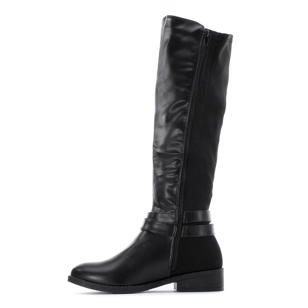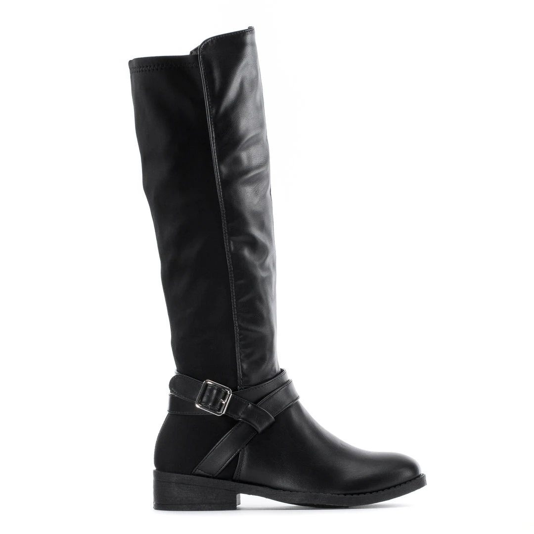 Complement your outfits with a knee-high riding style boot. The Celia Peri 50/50 Riding boots are fashionable, durable, and perfect for the rain and chilly weather. The stretchy back half is flexible for a comfortable fit, and the fashion buckles enhance your look.