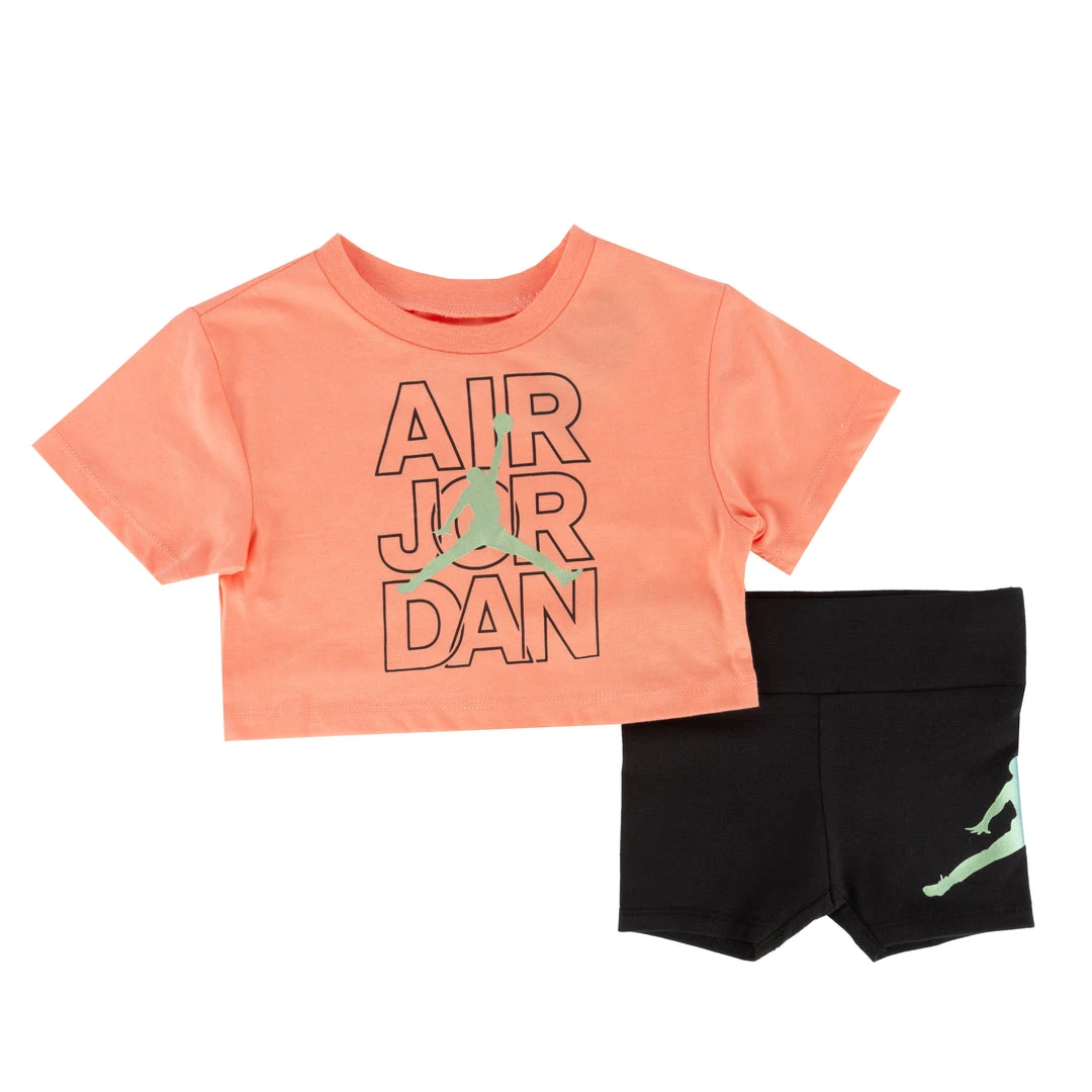 Perfect for play and even more play. The Jordan Air Wild Bike short set includes a roomy cropped tee with matching stretch bike shorts. Take the effort out of mix and match. This outfit comes easy and effortless.